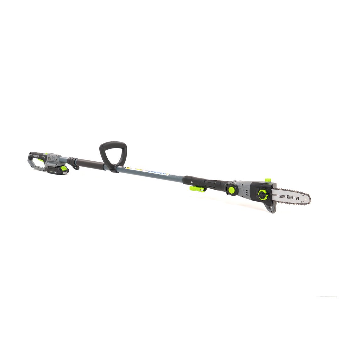 : NacTeleskopická aku píla, dosah 190–270 cm, lišta a reťaz Oregon, rýchlosť 5,5 m/s, akumulátor 20 V 2 Ah.