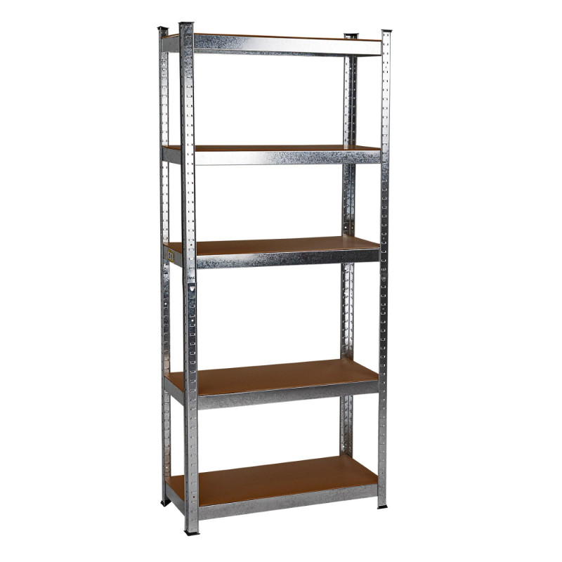 Kovový bezskrutkový regál s piatimi MDF policami s jednoduchou montážou, stĺpiky vyrobené výlučne z pozinkovaného kovu, ideálny pre použitie v domácnosti, záhrade a hobby. Vertikálne prvky pozostávajú zo štyroch jednodielnych stĺpikov, ktoré sú počas montáže navzájom spojené priečkami.