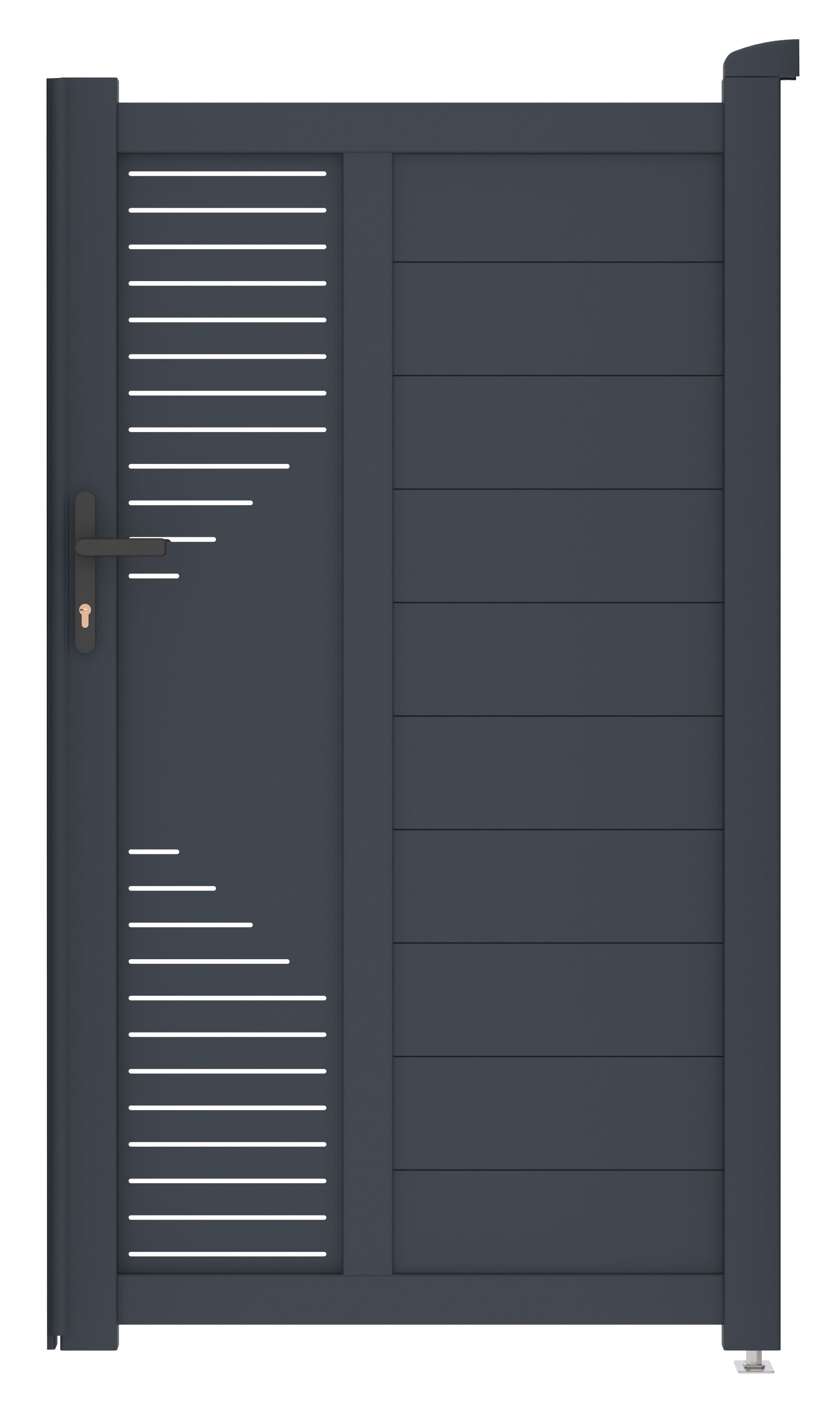 : G21Vchodová zamykateľná hliníková bránka s pravým otváraním. Kľučka, FAB zámok, otváranie dovnútra, vysoká odolnosť a dlhá životnosť, práškový nástrek, možnosť prispôsobenia šírky na mieru.