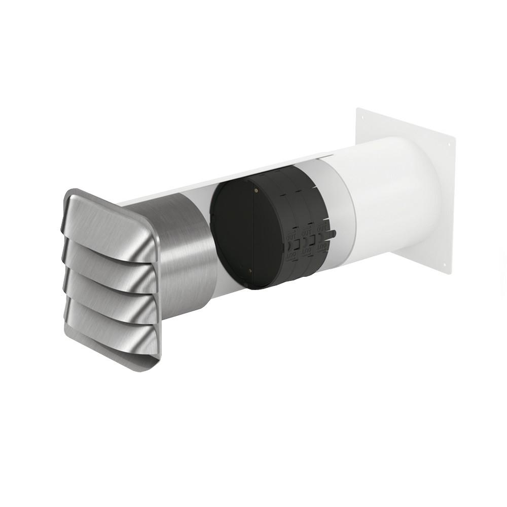Teleskopická stenová príruba s termoboxom a vonkajšou žalúziou z nehrdzavejúcej ocele. Aerodynamicky tvarované smerové lamely žalúzie E-Jal Col zabezpečujú optimálne odsávanie vzduchu.