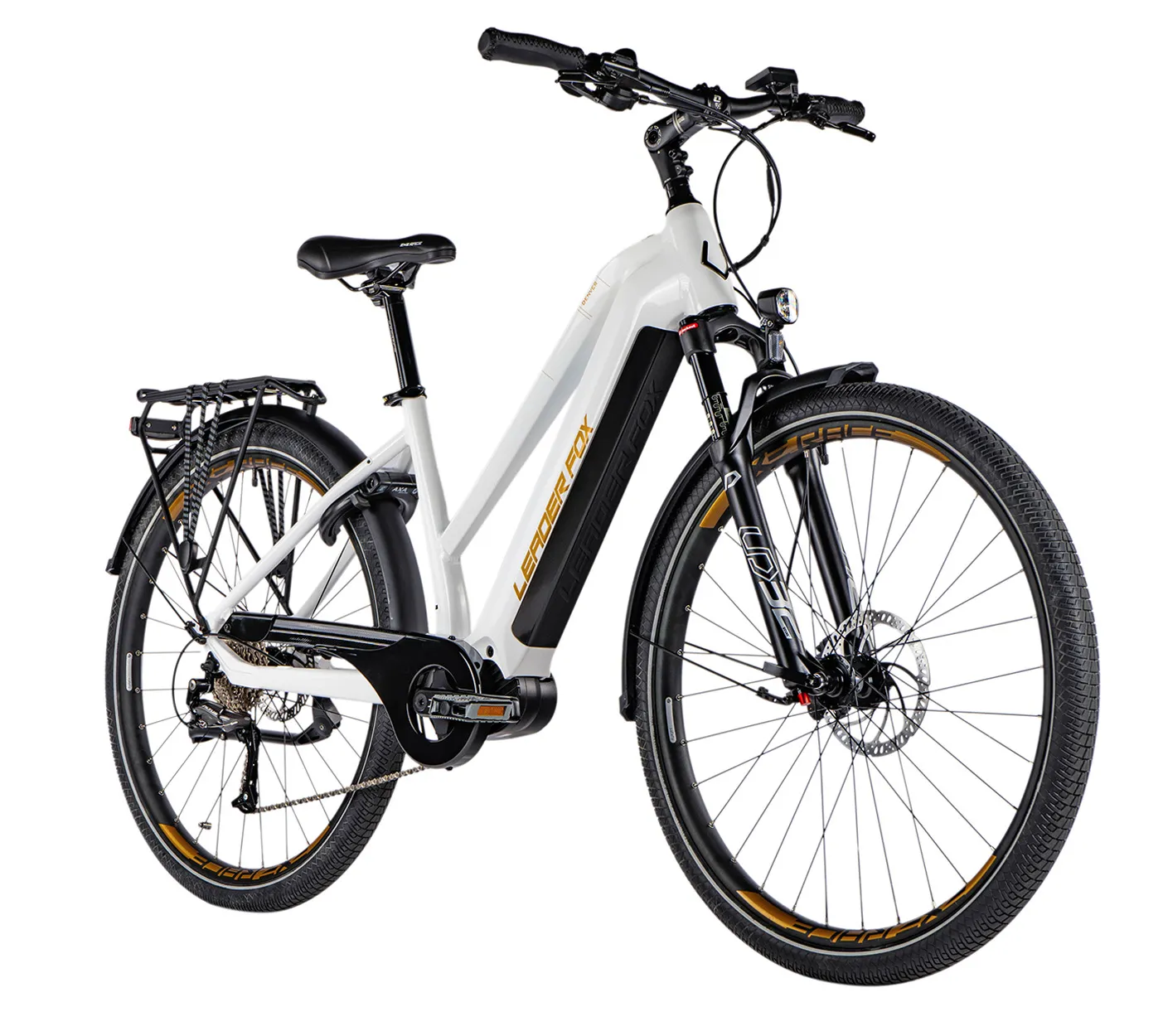 : Leader FoxTrekingový elektrobicykel, rám 16,5", veľkosť kolies 29", počet rýchlostí 9, odporúčaná výška cyklistu 150–165 cm, nosnosť 120 kg, farba biela.