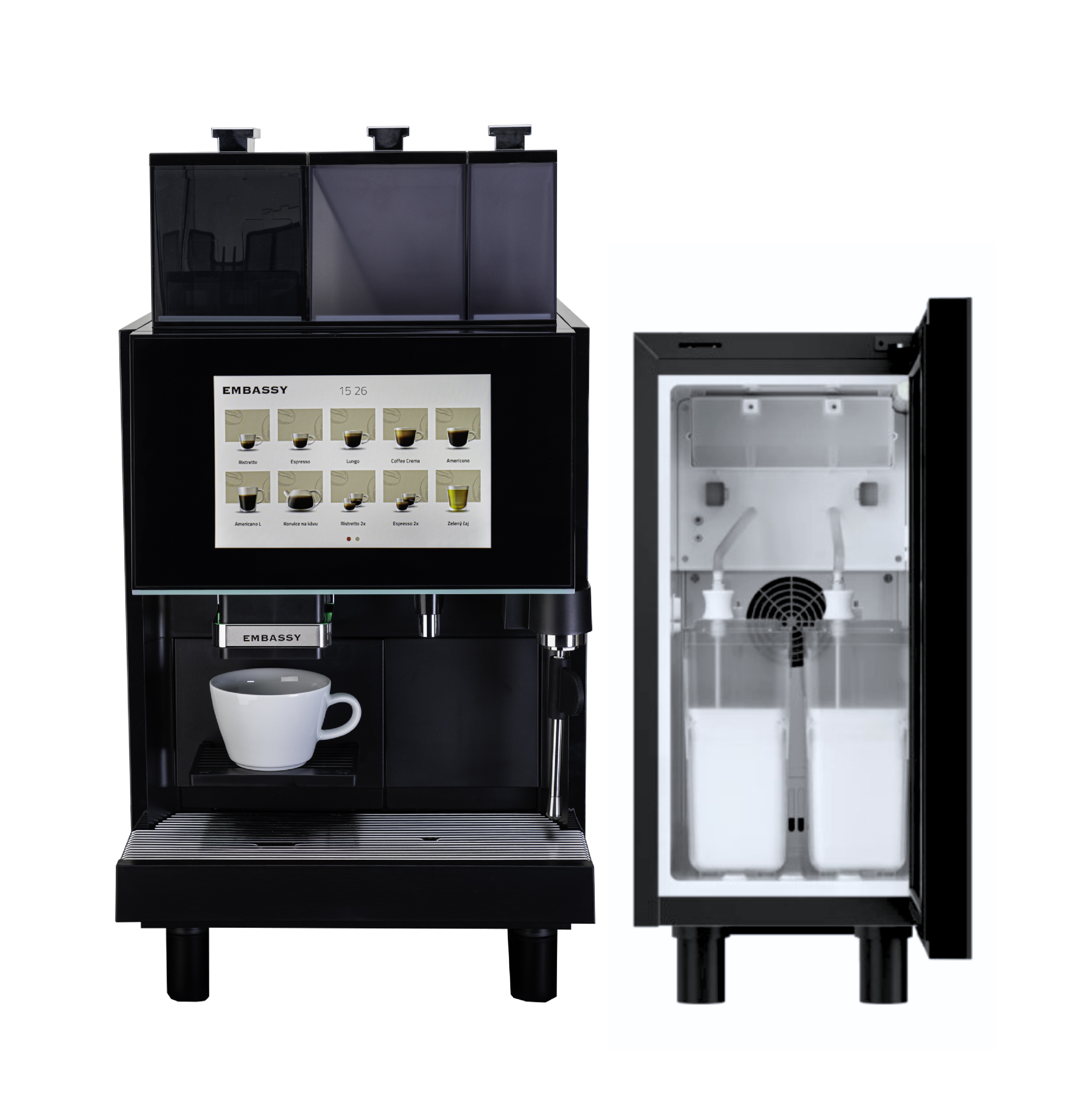 : EmbassyEmbassy Bogota je profesionální automatický kávovar pro přípravu 200 káv denně. Je vybaven připojením na vodovodní řád, čtyřlitrovou vodní nádržkou, ocelovým mlýnkem, desetipalcovým dotykovým displejem a automatickým mléčným systémem pro tvorbu mikropěny o teplotě až 70 °C. Set s kompresorovou lednicí C22 pro napojení na dva druhy mléka.