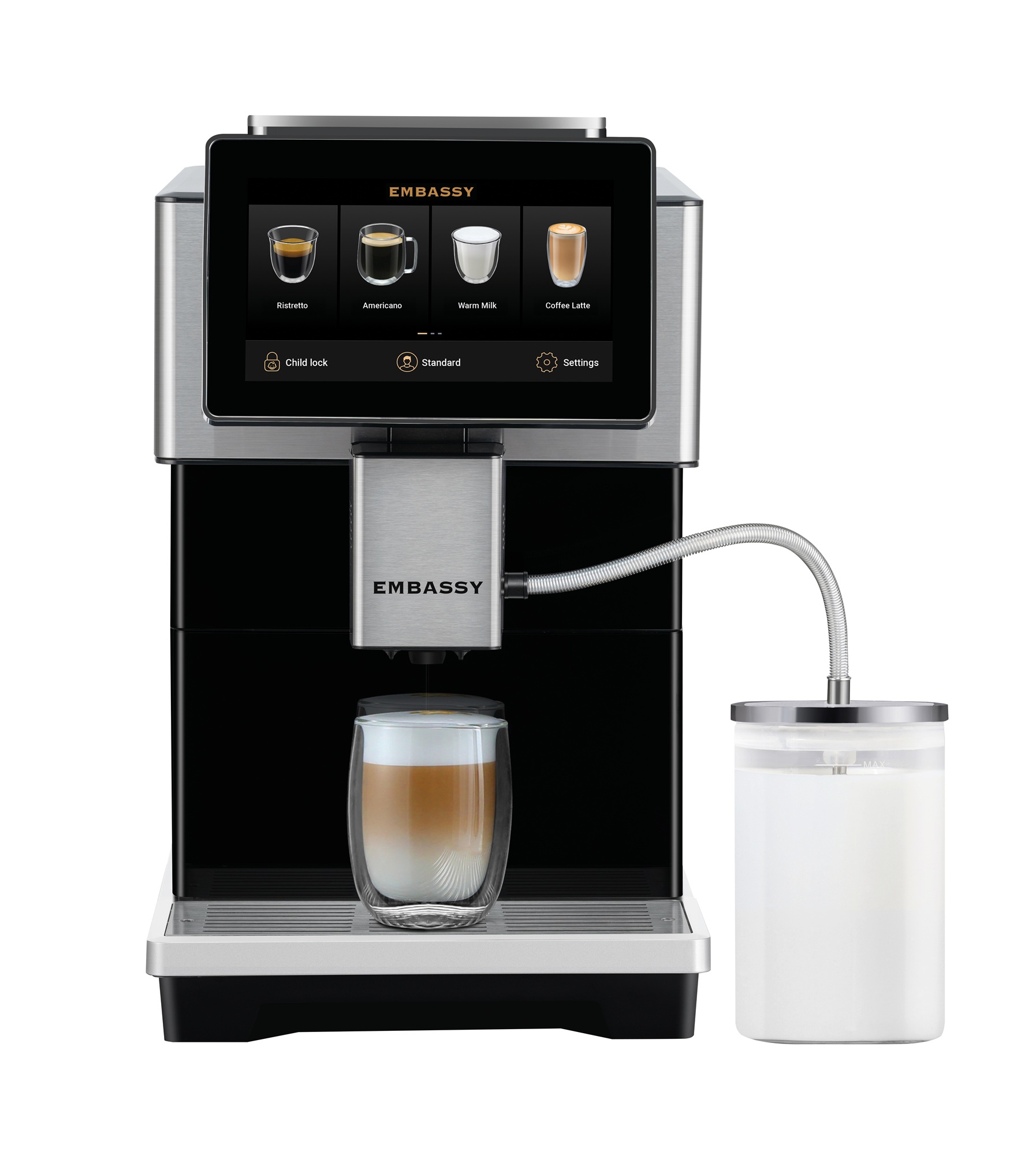 : EmbassyPoloprofesionální kávovar pro přípravu 20 káv denně. Kávovar přichází se skleněnou karafou a mléčnou hadičkou v kovovém obalu.