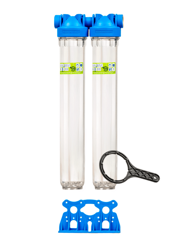 65.10 Filter MASTER 20" DUO obal, pripojenie 1" je určený pre všetky typy vložiek: mechanická, chlór, baktérie, dusičnany, železo. Vložka na zamedzenie tvorby vodného kameňa sa môže v tomto prípade použiť len na technické účely, nakoľko voda preteká cez polyfosfátovú vložku plnoprietokovo a nie je preto vhodná na pitné účely.
