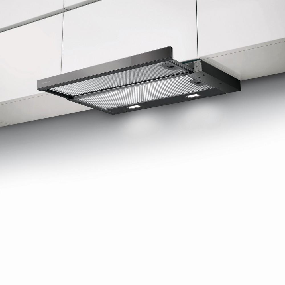 Vstavaný odsávač pár FLEXA je veľmi elegantným riešením pre kuchyne s obmedzeným priestorom. Nízka vstavaná časť odsávača navyše umožňuje využiť zostávajúci priestor v skrinke nad odsávačom.
