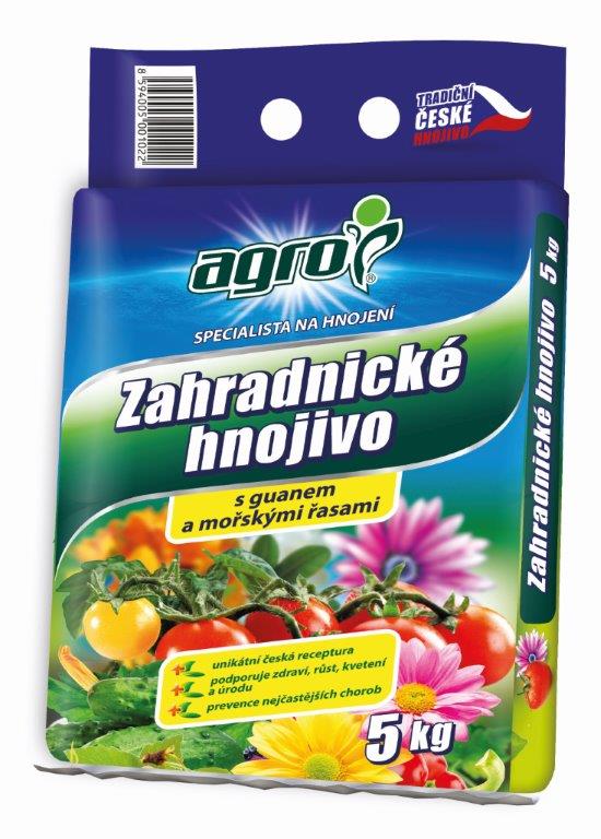 : AgroZáhradnícke hnojivo Agro s unikátnou českou receptúrou, obsahuje 5 kg bezchloridového granulovaného organominerálného substrátu. Poskytuje vysoké dávky živín, ktoré pôsobia až 2 mesiace a dobu použiteľnosti od dátumu výroby 5 rokov.