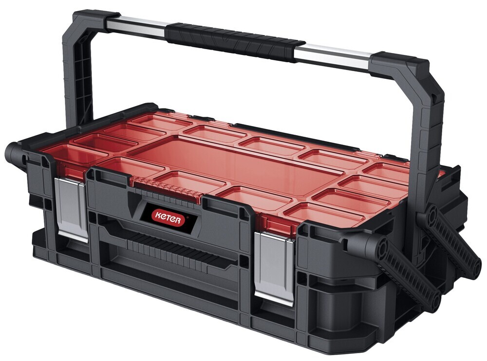 Praktický dielenský organizér do dielne značky Keter. Vnútorný priestor umožňuje prehľadné uloženie drobných dielov, príslušenstva a spojovacích prvkov do vyberateľných priehradiek.