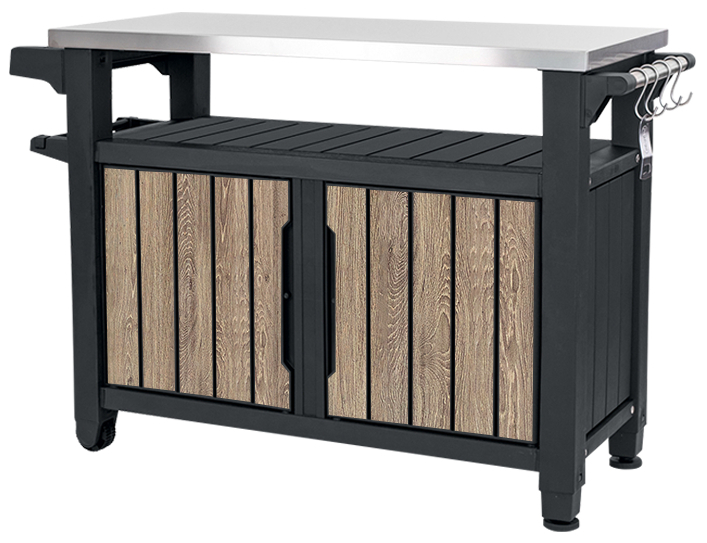 : KeterUNITY XL 207 L je moderná mobilná skrinka, ktorú oceníte predovšetkým pri grilovaní! Priestranná skriňa s dvojitými dverami vybavená funkčnou nerezovou doskou a praktickou rukoväťou s háčikom na uteráky, bude dobre fungovať pri dôležitých rodinných stretnutiach na terase alebo v záhrade.