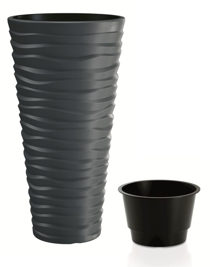 : ProsperplastVysoký kvetináč, objem 22 l, dizajn s textúrou vlniek, vhodný do exteriéru aj interiéru, v balení praktická vložka na sadenie rastlín, rozmery 29,6 x 53,1 x 29,6 cm, antracitová farba.