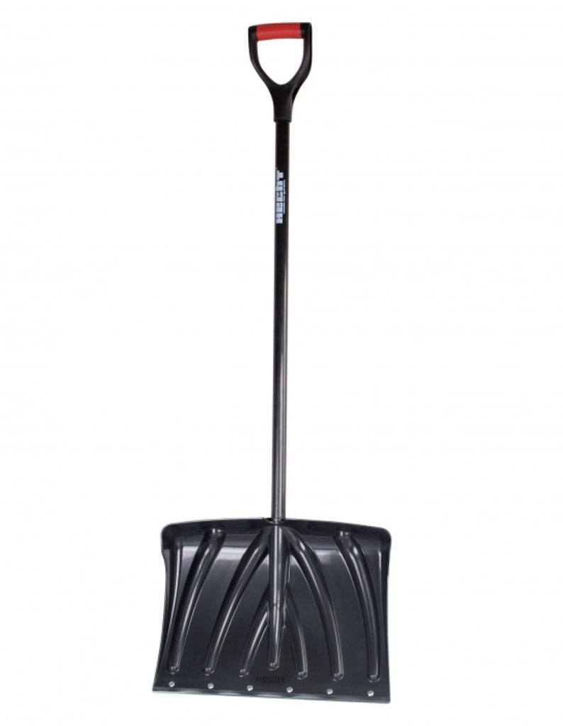 Plastový odhŕňač na sneh s plastovou násadou vystuženou oceľovou rúrkou, polypropylénová rukoväť. Výška 131 cm, šírka pracovného záberu 46 cm.