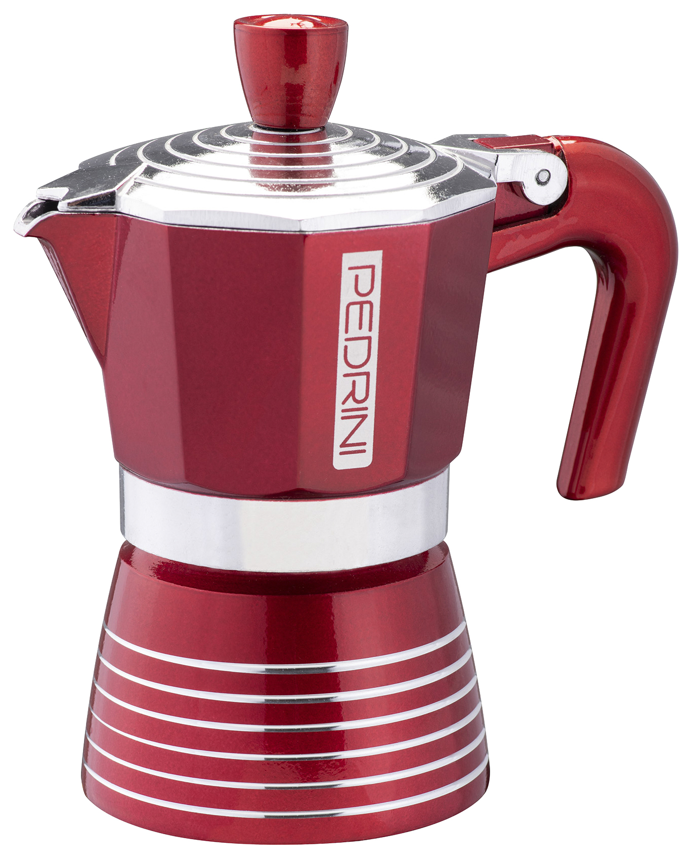 : PedriniDesignová moka konvička z potravinářského hliníku. Rukojeť konvičky je zhotovena ze speciálního termoplastu o přibližné tepelné odolnosti 210 °C. Konvička je natřena žáruvzdornou třpytivou glazurou a zdobí ji kruhové obrazce.