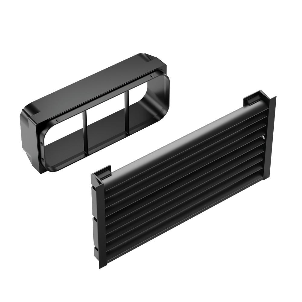 Lamelová vetracia mriežka z eloxovaných hliníkových profilov v matnej čiernej farbe.Ideálne riešenie pre odsávače pár integrované do varnej dosky s uhlíkovými filtrami v režime recirkulácie.
