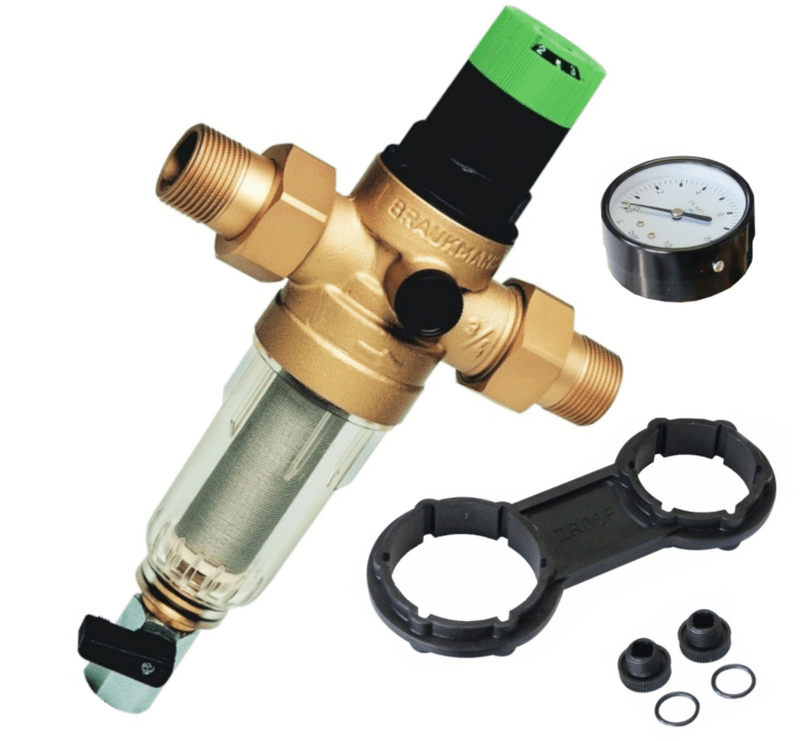 Redukčný ventil na vodu 3/4" s filtrom a manometrom, zabraňuje vstupu nečistôt, ako sú časti hrdze, zrná piesku a iné nečistoty, do rozvodov pitnej vody a zároveň udržiava konštantný tlak pitnej vody v systéme za ním. balenie taktiež obsahuje kľúč na maticu filtra a vypúšťací ventil.