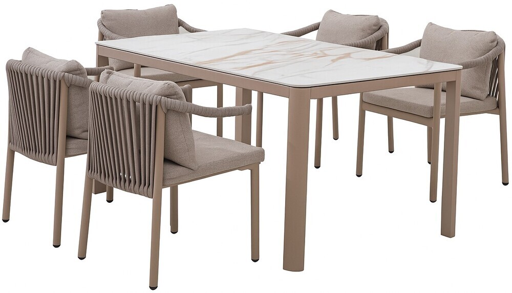 : RojaplastLuxusná hliníková súprava v cappuccino prevedení, doplnená o veľmi vkusný lankový, alebo povrázkový výplet. Moderná súprava, ktorá skvele zapadne do každého exteriéru či interiéru.