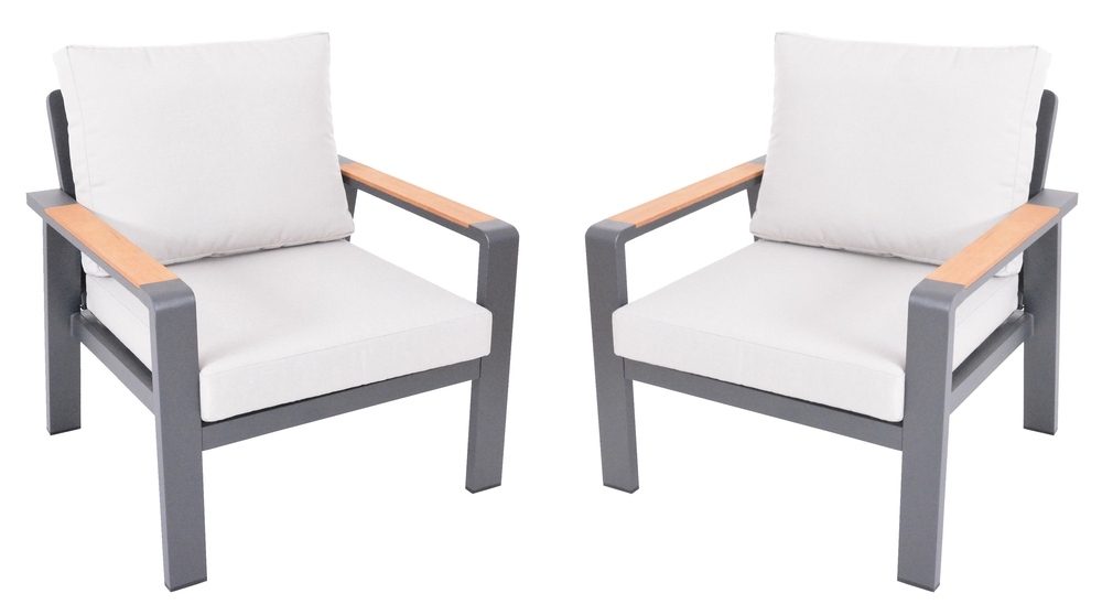 : RojaplastLuxusné hliníkové kreslá v grafitovom prevedení, doplnené o teakové podrúčky. Pohodlné podušky z polyesteru (250g/m2) s molitanovou výplňou (10 cm) z vodoodpudivej tkaniny, ktoré sú odolné voči UV žiareniu.