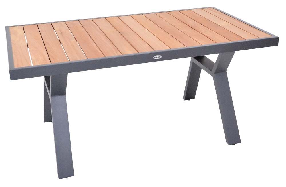 : RojaplastLuxusný hliníkový jedálenský stôl v grafitovom prevedení, doplnený o teakovú dosku stola. Hliníkový jedálenský stôl má vďaka použitým materiálom a modernému vzhľadu naozaj široké využitie, je vhodný pre vnútorné aj vonkajšie priestory - záhrady, terasy, zimné záhrady alebo napríklad do uvítacej haly či recepcie.