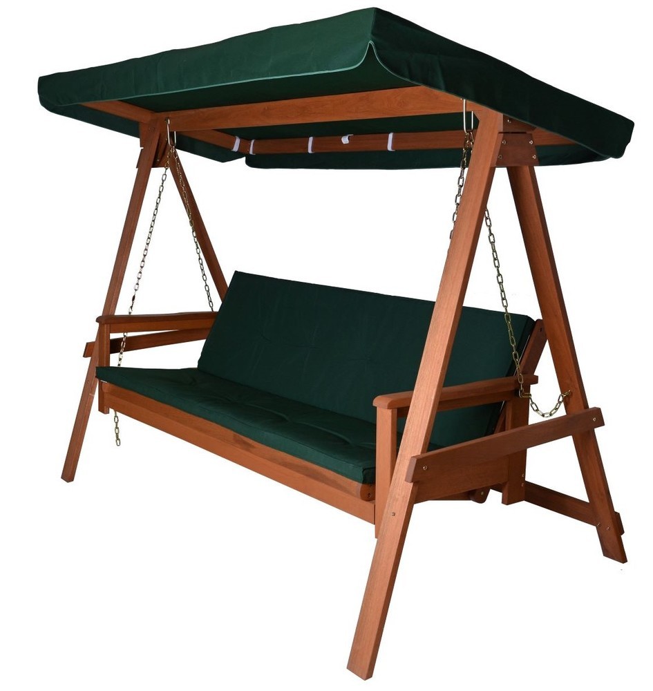 : RojaplastMasívna záhradná hojdačka z tropického dreva SHOREA. Podušky a strieška v zelenej farbe - súčasť balenia.