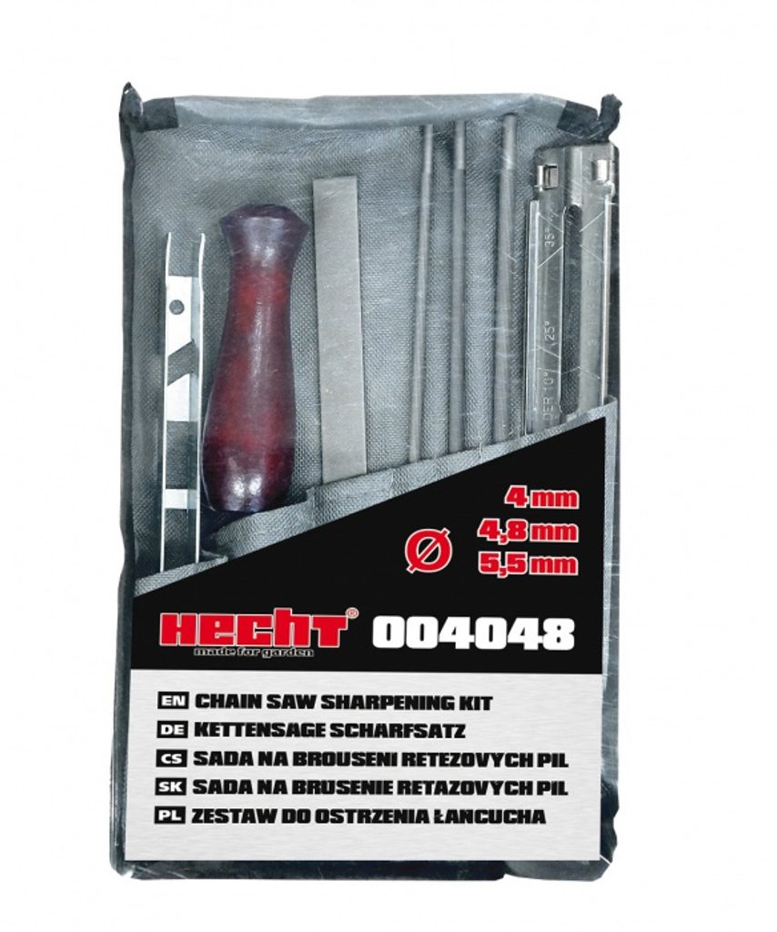 8.12 Sada pre brúsenie pílových reťazí Hecht. Sada obsahuje jeden plochý pilník, okrúhle pilníky priemeroch 4 mm, 4,8 mm a 5,5 mm, držiak pilníkov, uhlové a hĺbkové dorazy pre správne vedenie pilníkov pri brúsení.