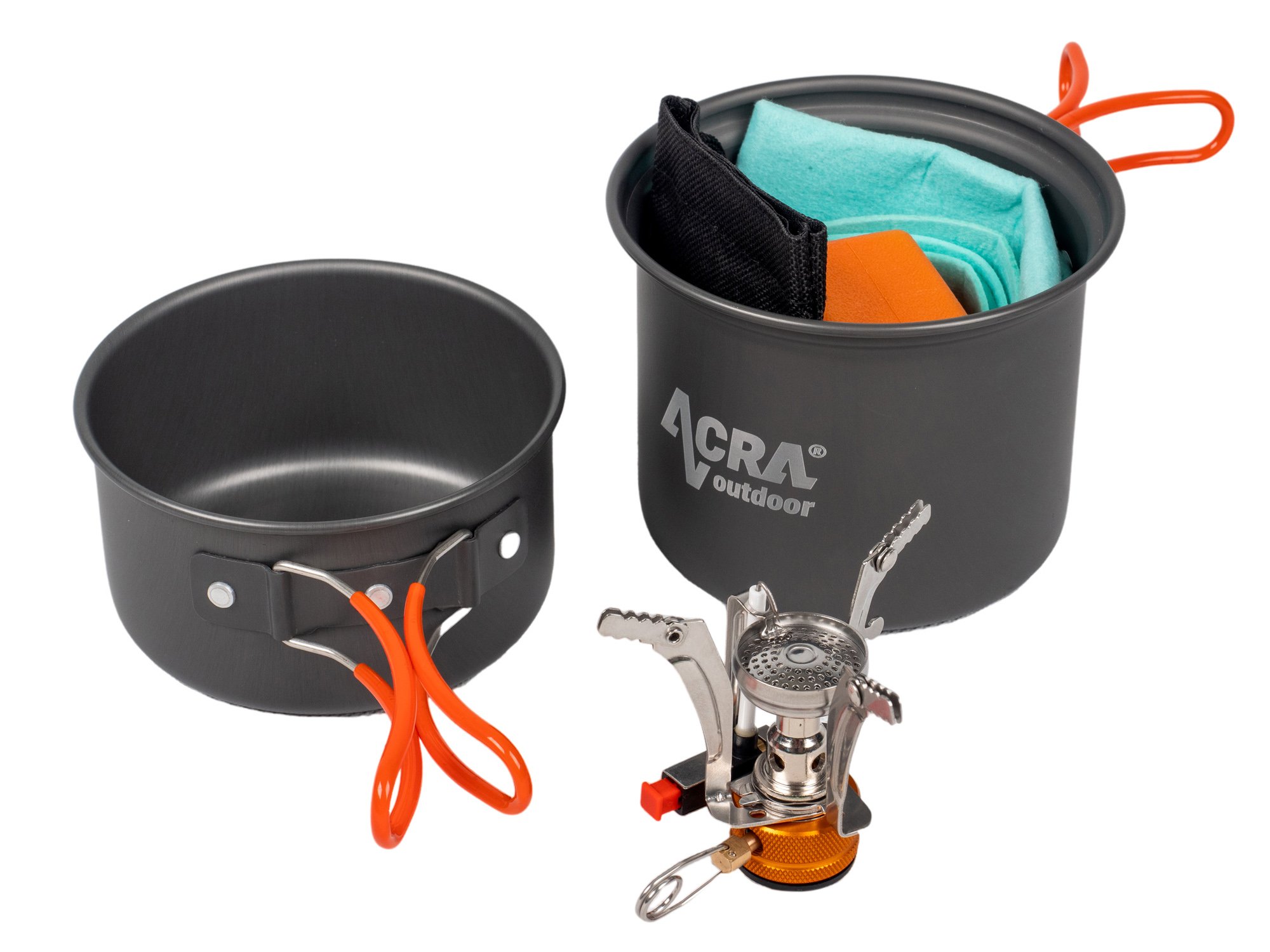 : AcraKempingový set riadu vrátane plynového variča bez kartuše, príprava jedla až pre 2 osoby, skladacie rukoväte, kompaktné prevedenie, odolná hliníková zliatina a plast, rovnomerný ohrev.