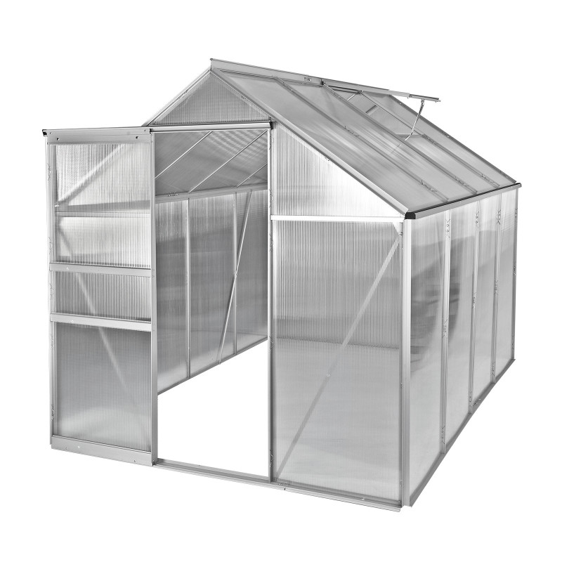: DEMASkleník so 4 mm hrubými polykarbonátovými stenami. Hliníková konštrukcia, jedno strešné okno, dobré udržiavanie tepla, vysoká UV ochrana, odkvap na pravej aj ľavej strane, veľké rolovacie dvere. Slnečné lúče sa cez platne lámu a nemôže tak dôjsť ku škodlivému bodovému ožarovaniu.