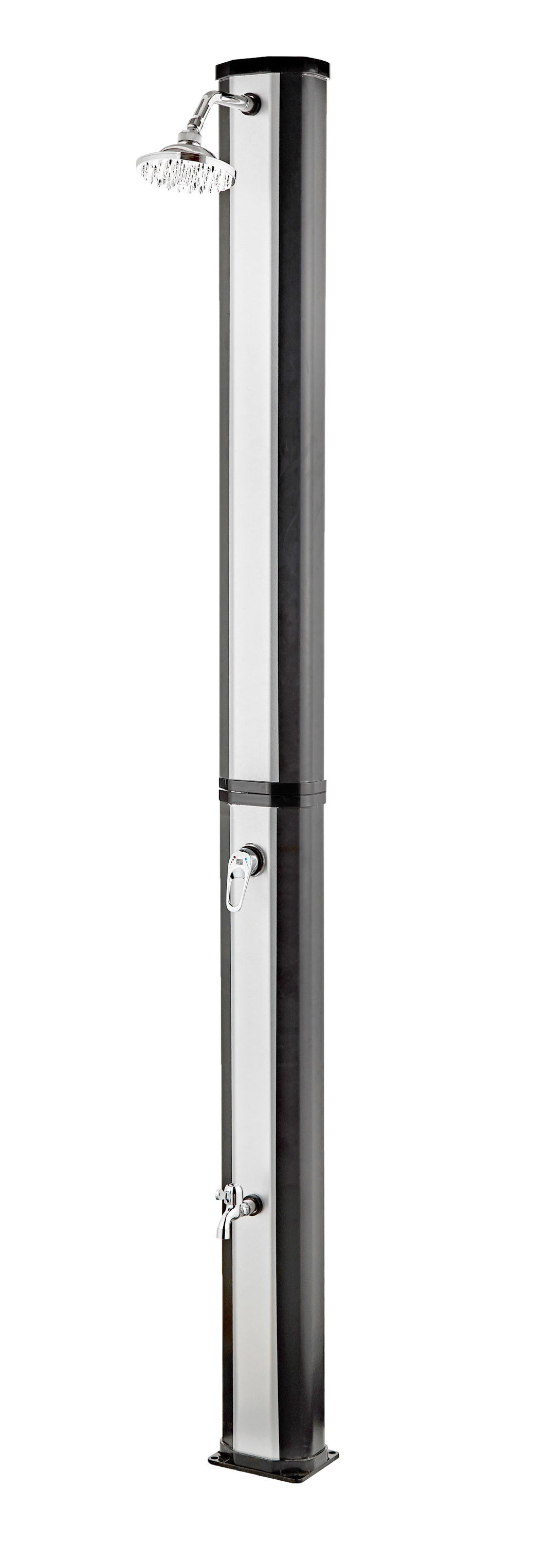 Solárna sprcha, objem 60 l, ohrev vody až na 60 °C, nastavenie teploty pákovou batériou, praktický kohútik na oplach nôh. Pripojenie na vodovodný rozvod pomocou záhradnej hadice, jednoduchá inštalácia.