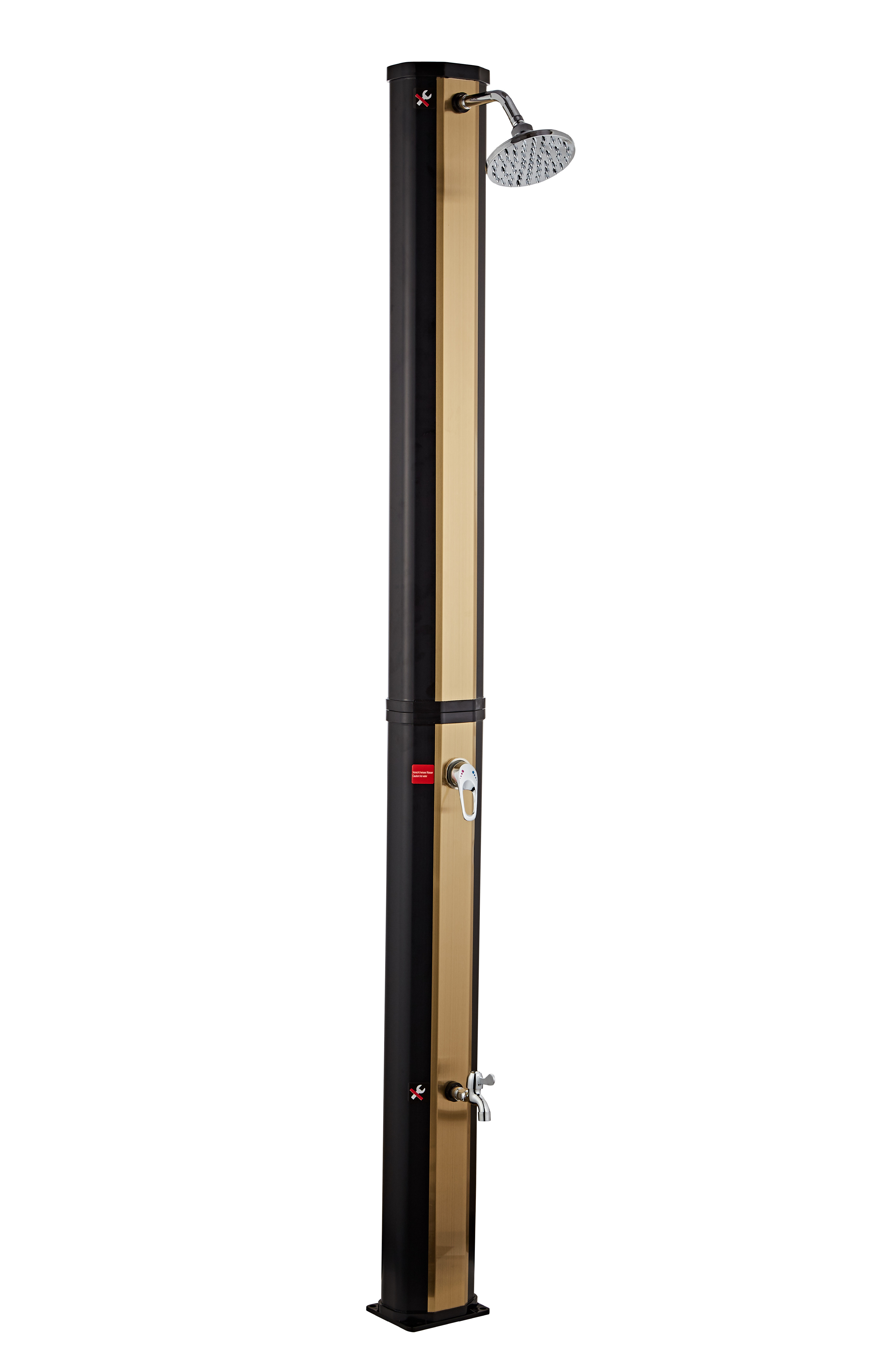 : CF GROUPElegantná solárna sprcha NEOVA Korfu 35L v čiernej a zlatej farbe využíva slnečnú energiu na ohrev vody až na 60 °C. S objemom 35 litrov a praktickým kohútikom na oplachovanie nôh je ideálna na vonkajšie použitie. Jednoduchá inštalácia a ekologický prevádzka bez elektrickej energie – osvieženie, ktoré šetrí energiu.