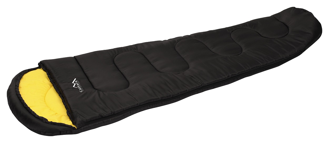 : CattaraMúmiový spací vak, letný, unisex. Komfortná teplota 20 °C, limitná teplota 15 °C, extrémna teplota 10 °C. Rozmery po zbalení 37 × 18 cm, hmotnosť 1 kg. Polyesterová taffeta 170T a izolačná vrstva z dutých polyesterových vlákien. Čierna farba.