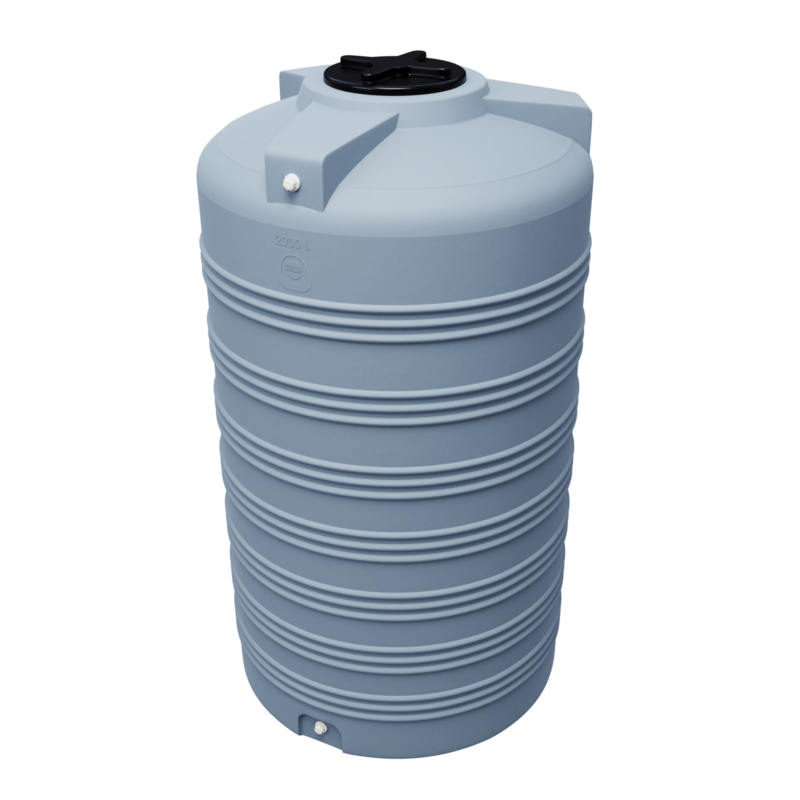 Sivý plastový sud na dažďovú vodu 2000L. Sud má A-TEST na uskladnenie pitnej vody i potravín.