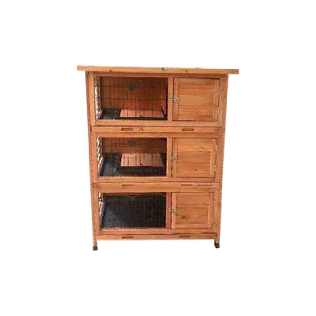 Trojposchodová králikáreň vyrobená z odolného jedľového dreva. Strecha pokrytá asfaltovými šindľami.