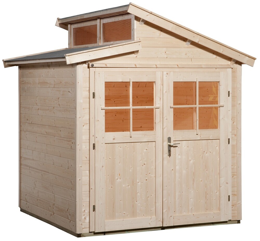: WEKAZáhradný domček WEKA 226 sa pýši vysokou stabilitou a odolnosťou. Odsadená šikmá strecha obsahuje dve integrované strešné okná, ktoré poskytujú dostatok prirodzeného svetla.