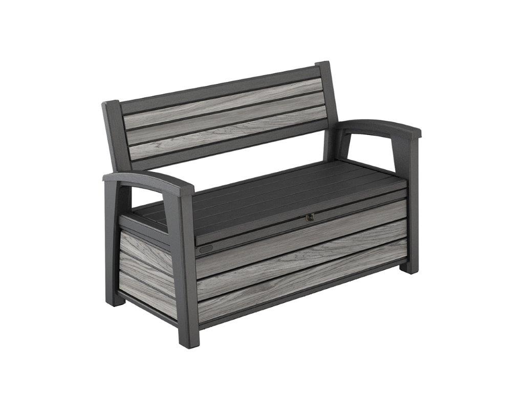 : KeterLavica a úložný box o objeme 265 l, nosnosť lavice 2× 110 kg, plast s dekorom dreva, odolný voči poveternostným vplyvom, možnosť uzamknutia.