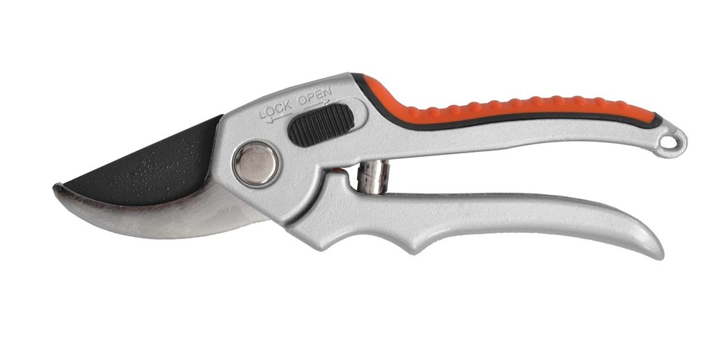 8.12 Dvojčepeľové záhradné nožnice, ergonomické kovové rukoväte s protišmykovým povrchom. Integrovaná vratná pružina a poistka otvorenia.