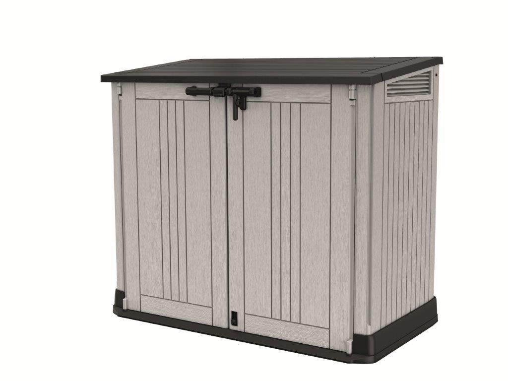 : KeterUzamykateľný a vysoko odolný prístrešok na popolnice, záhradné náradie a ďalšie príslušenstvo, zošikmený prah pre kontajnery s kolieskami, 880 l kapacita, možnosť inštalácie poličiek, veľmi kvalitný materiál, šedá farba.