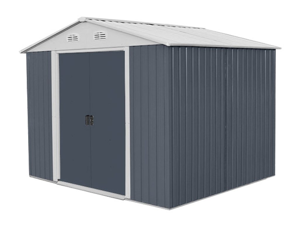 272.35 Kvalitný záhradný domček s odolnou konštrukciou v kombinácii šedej a tmavo šedej farby. Rozmery vrátane presahu strechy sú 1960 x 2580 mm.