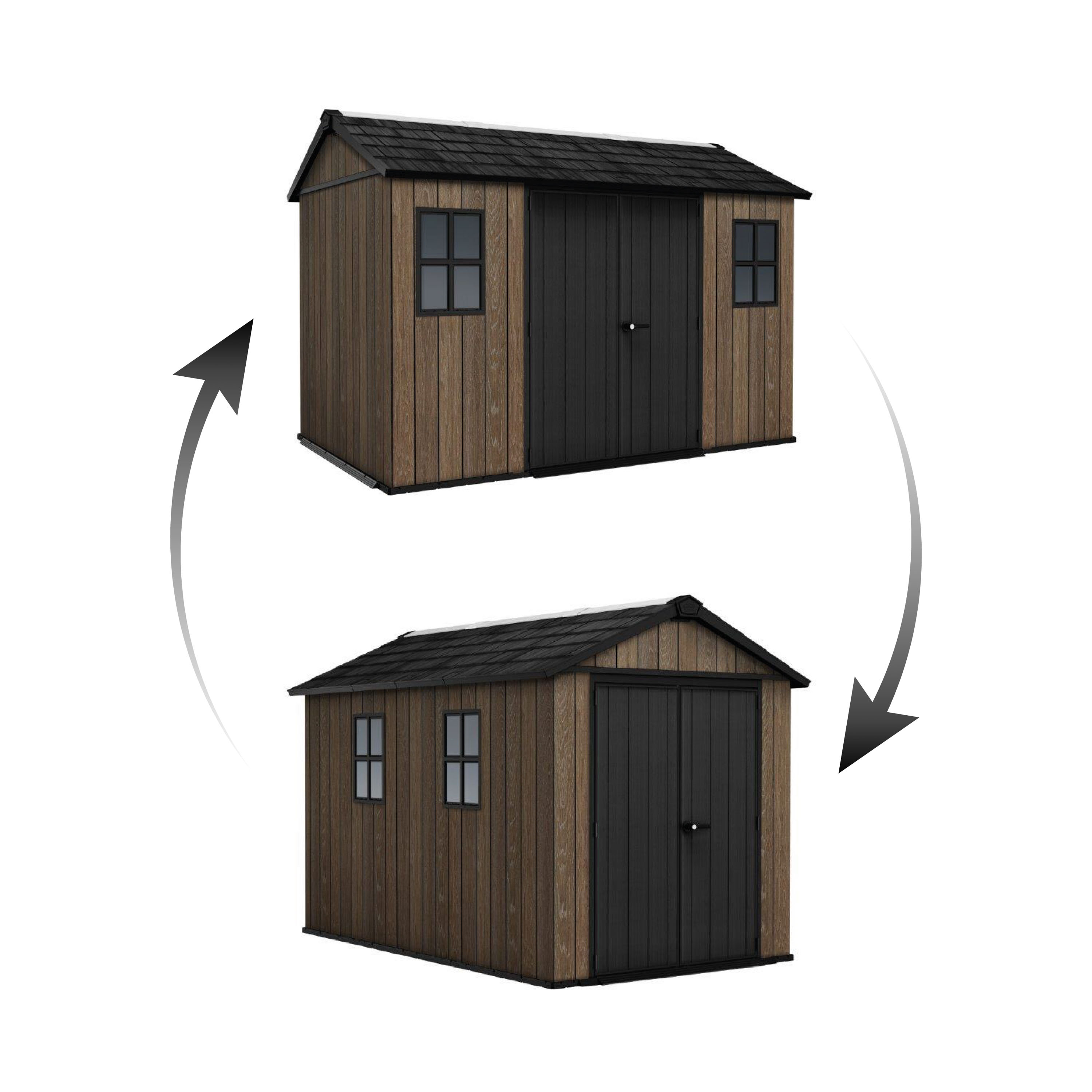 : KeterZáhradný domček, 2 možnosti montáže, 3,5 × 2,46 × 2,3 m, sedlová strecha, podlaha 150 kg/m2, DECOCOAT, Walnut.