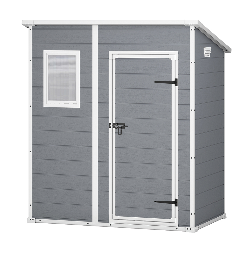 : KeterZáhradný domček na skladovanie záhradného i dielenského náradia, športového náčinia a ďalšieho vybavenia, pultová strecha vydrží zaťaženie až do 75 kg/m2, podlahový panel s výdržou až 150 kg/m2, 16mm dvojitej steny, ventilačný systém. Šedá farba.