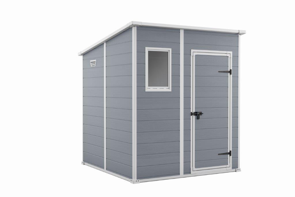 : KeterZáhradný domček pre skladovanie záhradného i dielenského náradia, športového náčinia a ďalšieho vybavenia, pultová strecha vydrží zaťaženie až do 75 kg/m2, podlahový panel s výdržou až 150 kg/m2, 16mm dvojité steny, ventilačný systém. Šedá farba.