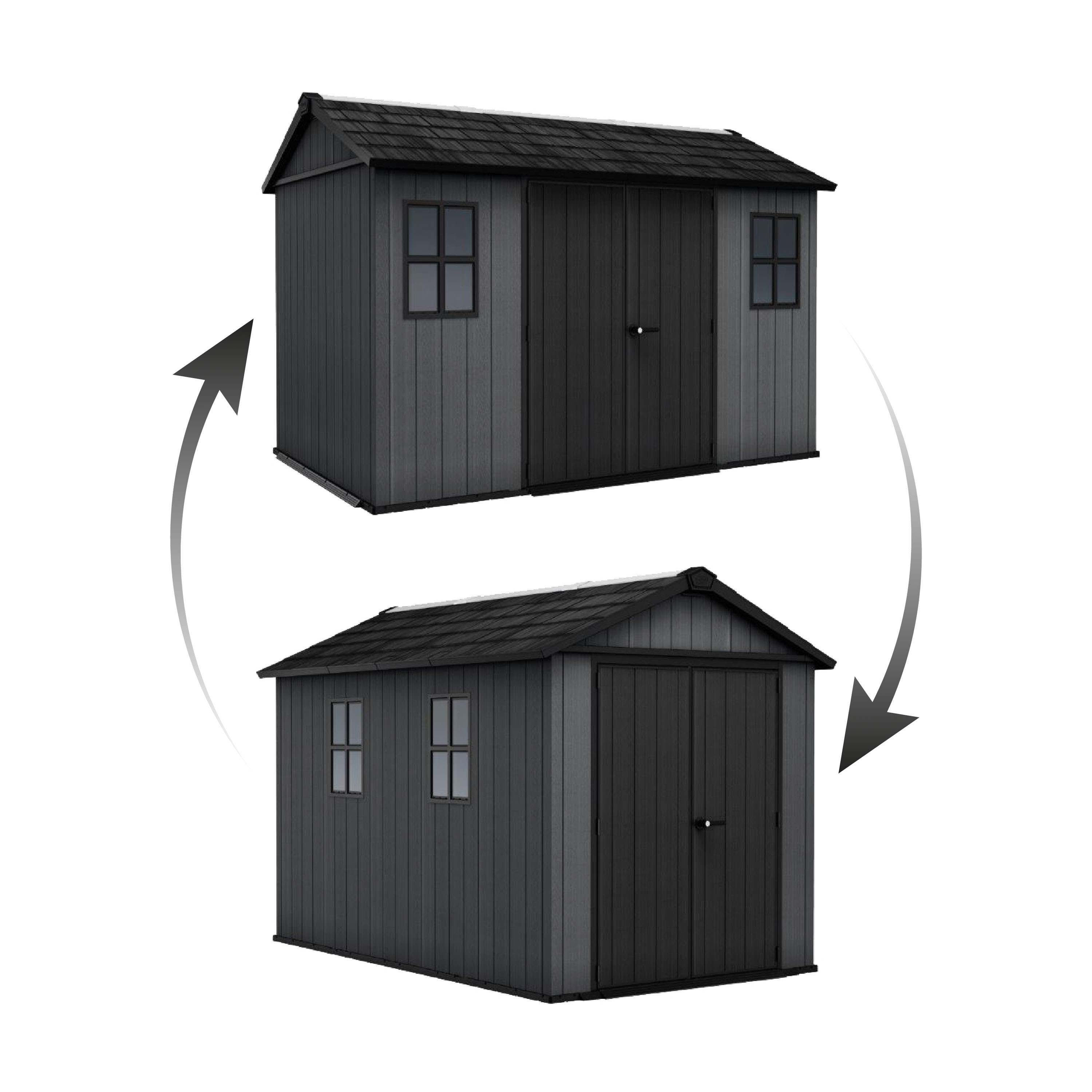 : KeterZáhradný domček na skladovanie záhradného, ??dielenského náčinia a ďalšieho vybavenia, 2 možnosti zostavenia, 2,3 x 2,46 x 3,5 m, sedlová strecha a podlahový panel pre zaťaženie až 150 kg/m2, dvojité steny, okienka. Materiál Evotech. Tmavosivá farba.