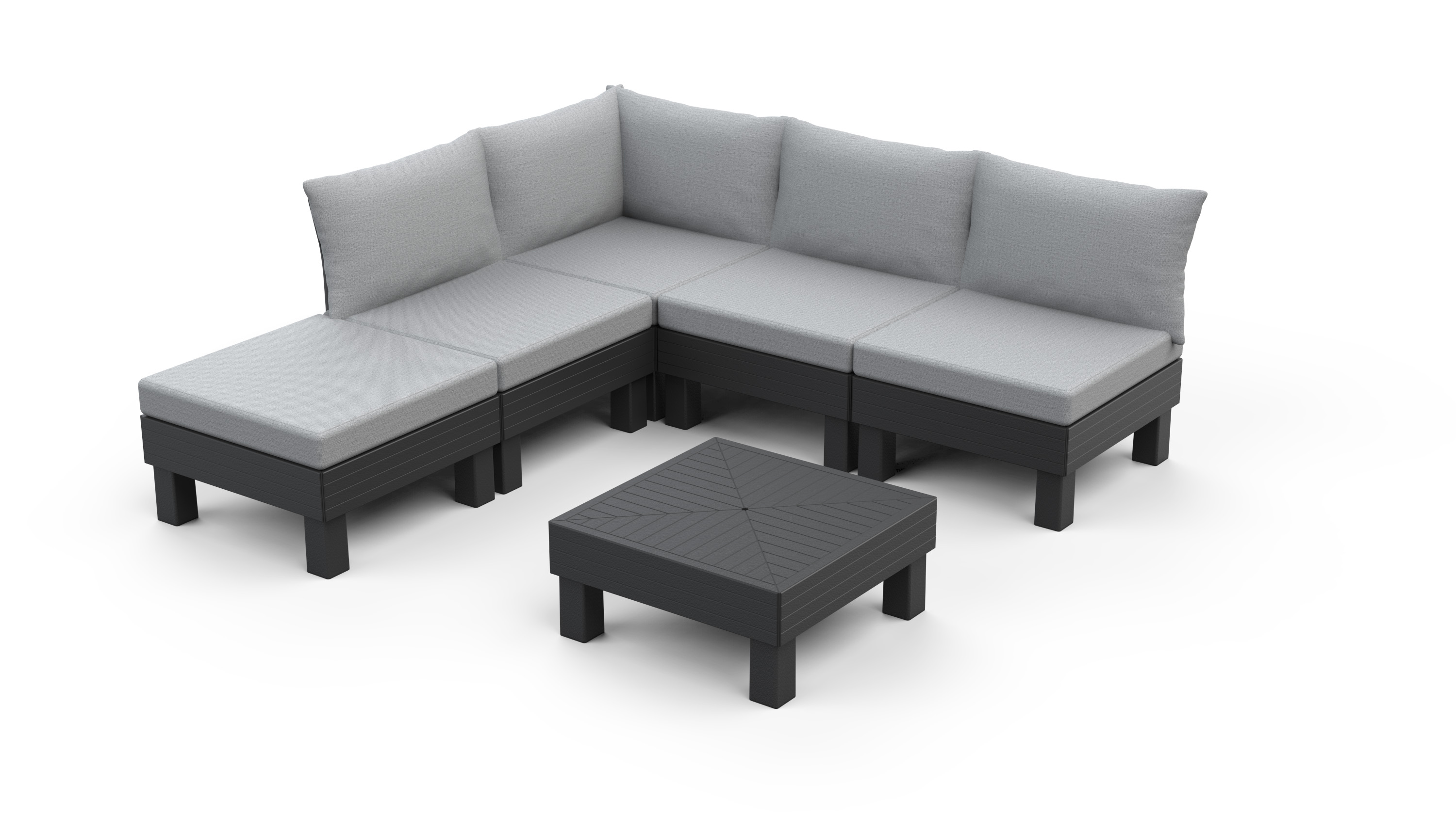 : KeterModulárny set, 5 miest na sedenie, odolnosť voči UV žiareniu a poveternostným podmienkam, vysoké podsedáky so spodnou protišmykovou úpravou pre väčšie pohodlie, jednoduchá údržba aj montáž.
